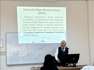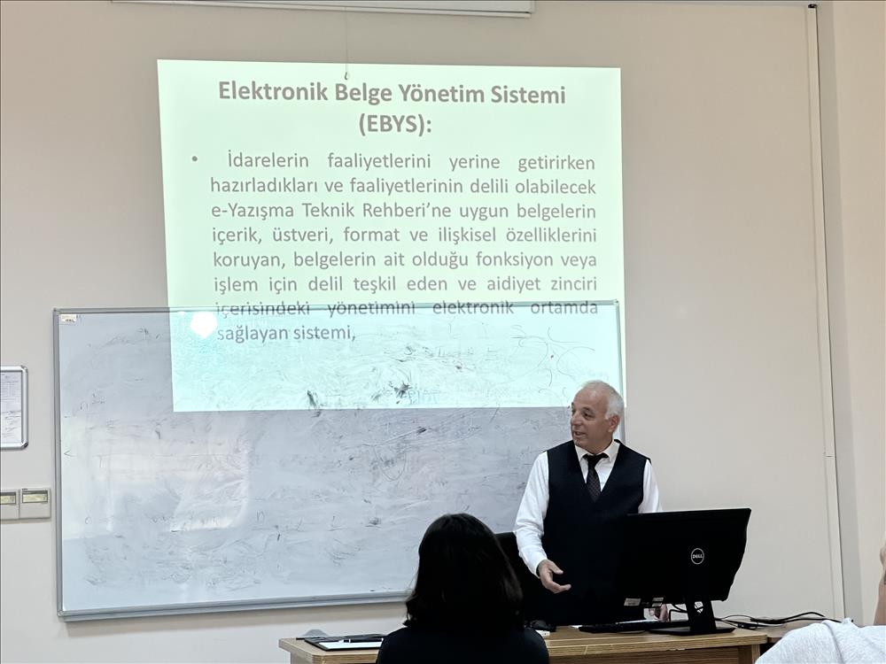 Eğitim kapsamında Elektronik Belge Yönetim Sistemi (EBYS) işleyişi; elektronik belge, fiziksel belge ve harici elektronik belge kavramlarının tanımları ve bu belge türlerine yönelik sistem uygulamaları ele alınmıştır. Katılımcılar, teori ve pratik uygulamayı bir araya getiren kapsamlı bir içerikle süreç yönetimine ilişkin önemli kazanımlar elde etmiştir.